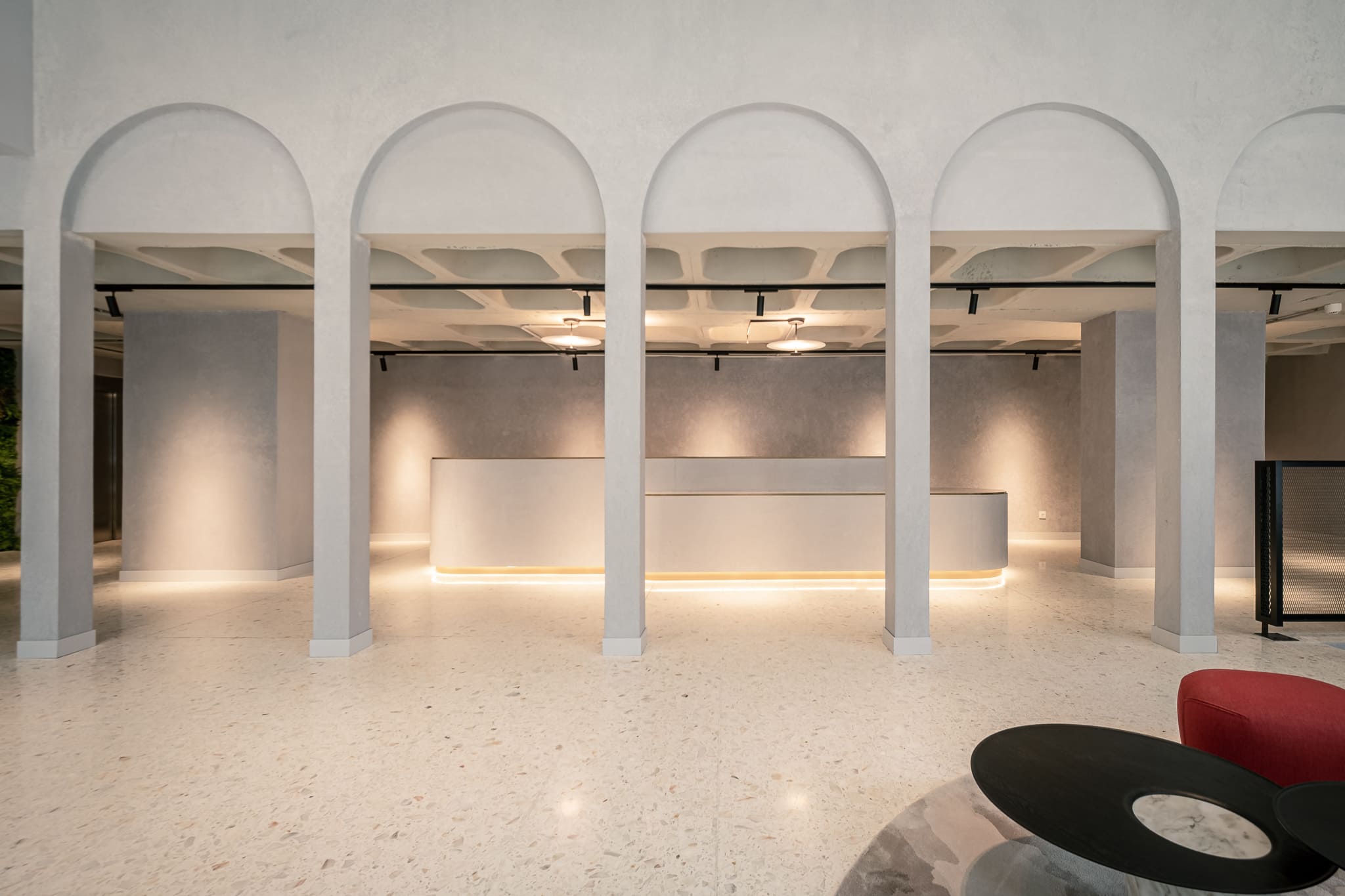 Marmur Fine, a mass-coloured lime and marble powder-based plaster, takes centre stage in the wall decorations